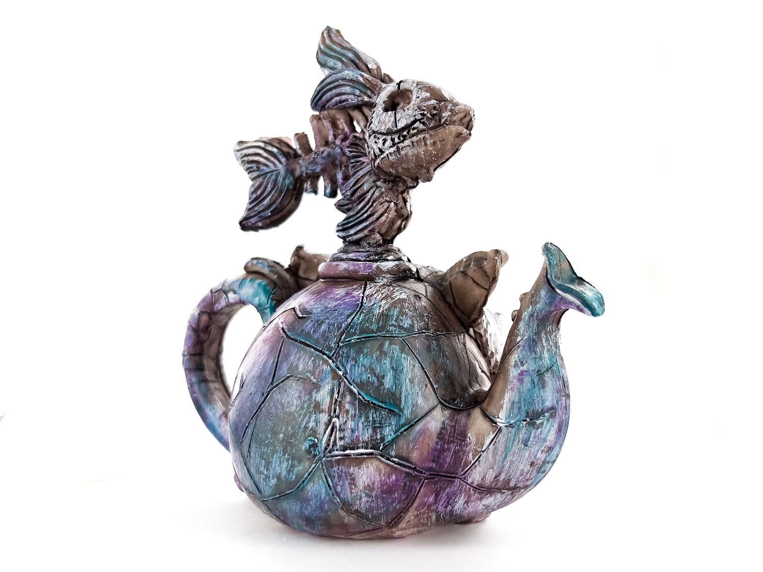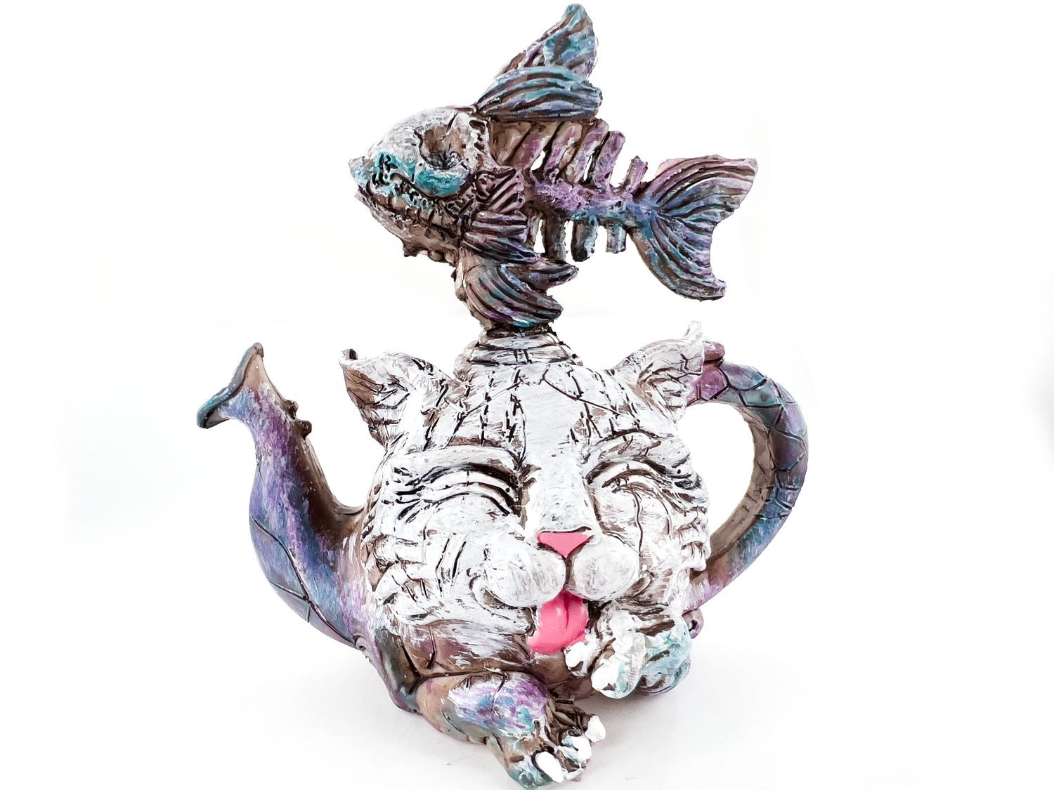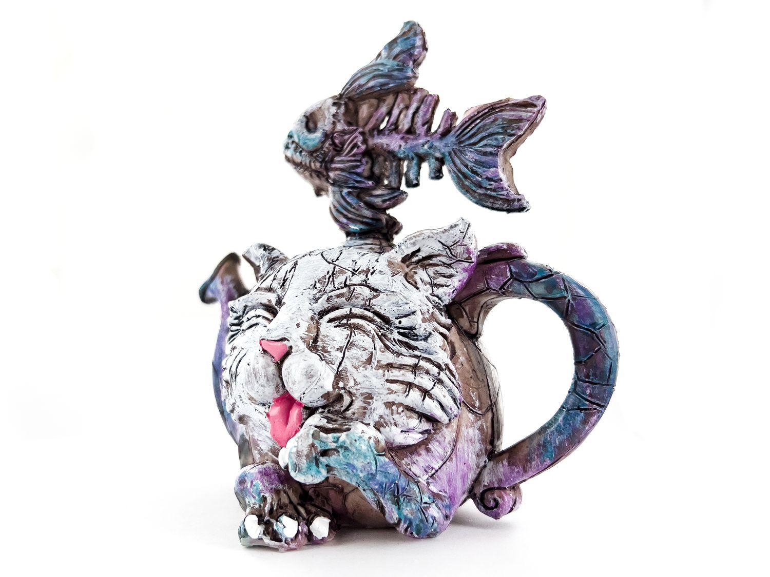 Статуэтка - чайник имеет форму симпатичного кота с детализированными чертами и хвостом, который служит в качестве ручкой. Он выполнен из полистоуна высокого качества, что обеспечивает прочность и долговечность изделия.