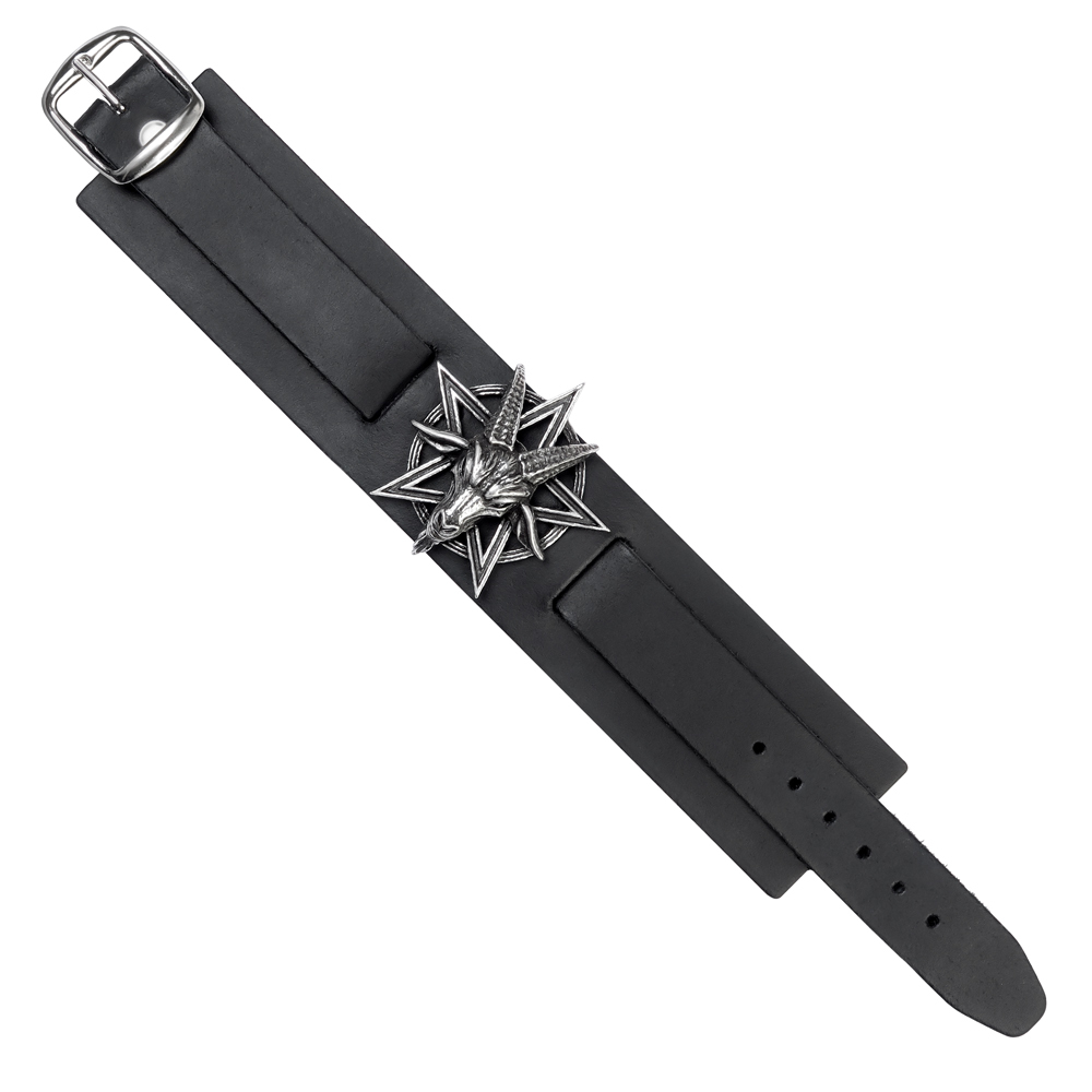 Изображенный на оккультной пентаграмме характер портрет Элифаса Леви и изображение дуалистического, козлиного божества, символизирующего равновесие во всем, и печально известного как еретический предмет поклонения рыцарей тамплиеров, который в 1307 году подверг их преследованиям и, в конечном счете, к их падению. Итальянская кожа, 1 ½ дюйма шириной, двойной черный кожаный ремешок на запястье с винтажным изображением в 3D-моделированной козлиной головы, установленной над большой пентаграммой. С регулируемой, стальной пряжкой. Изделия в индивидуальной фирменной упаковке, включающей гарантию, фирменную бирку "Сваровски" и инструкцию по уходу. Разработаны и изготовлены вручную в Англии с использованием *Swarovski элементов и английского пьютера. Цвет кристаллов зависит от наличия и может отличаться от показанного изображения. Вес и размеры: H: 50 мм (1,97 дюйма) W: 48 мм (1,89 дюйма) D: 14 мм (0,55 дюйма) Вес: 59 г (2,08 унции)