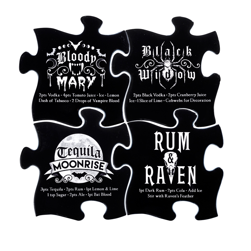 Этот необычный набор-пазл из четырех подставок под чашки создан специально для готической вечеринки или празднования Хэллоуина. Почему бы не попробовать уникальные рецепты коктейлей, но, наверное, не все в одну ночь?