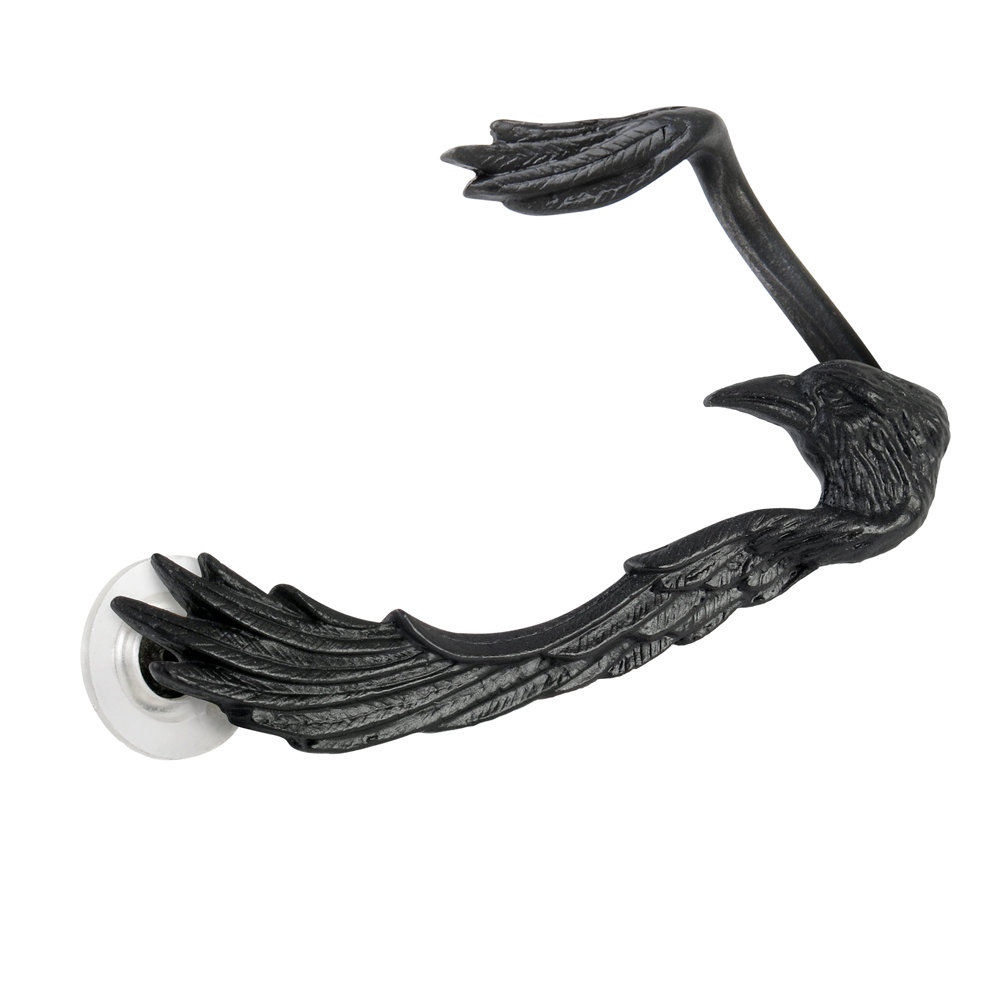 Подобно личному наставнику, готовому передать свой сверхъестественный интеллект своему хозяину и вызывающему сверхъестественные силы защиты, черный ворон обнимает ухо своего хозяина. Черные крылья и голова ворона выглядывают из-за левого уха. Крепится к нижней части уха гвоздиком из хирургической стали, а верхнее крыло можно регулировать путем мягкого сжимания по размеру. Вес и размеры: H: 56 мм (2,20") W: 39 мм (1,54") D: 15 мм (0,59") Вес: 13 г (0,46 унции).