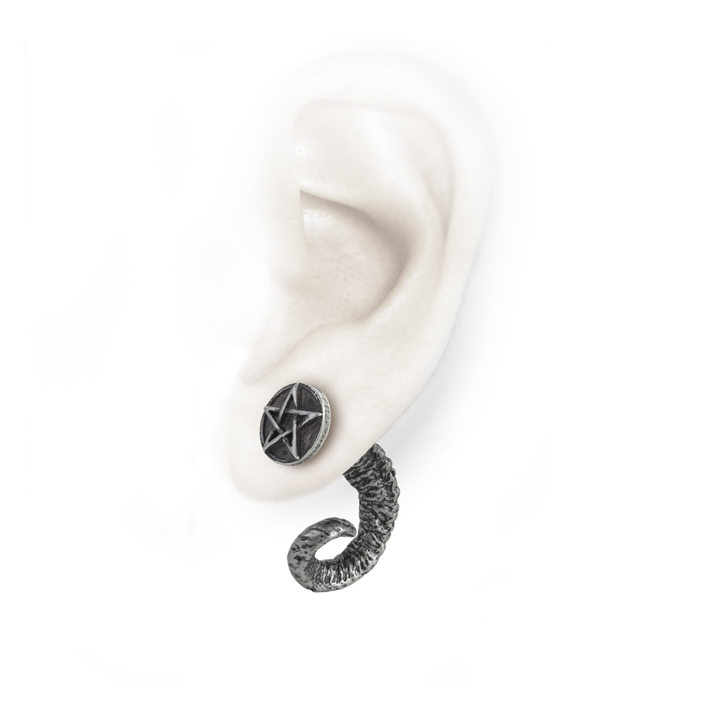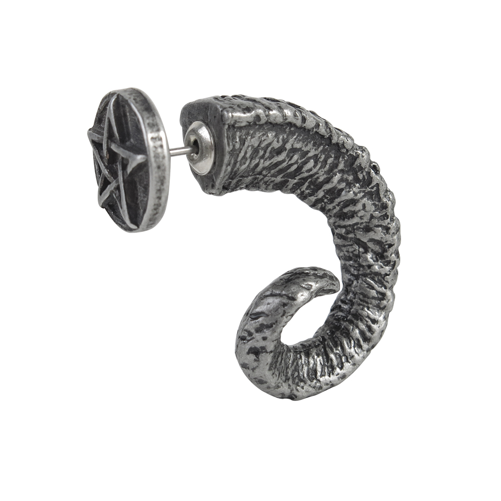 Внушенный безумной символикой Кроулианской философии и ритуальными языческими символами, этот первобытный тотем знаменует его обладателя как принципиально загадочного. Серьги из английского пьютера под старину в форме витого и закрученного бараньего рога. Застежка, со стандартным гвоздиком держателем из хирургической стали, выполнена в виде диска пентаграммы. Вес и размеры: H: 28 мм (1,10") W: 13 мм (0,51") D: 13 мм (0,51") Вес: 14 г (0,49 унции).