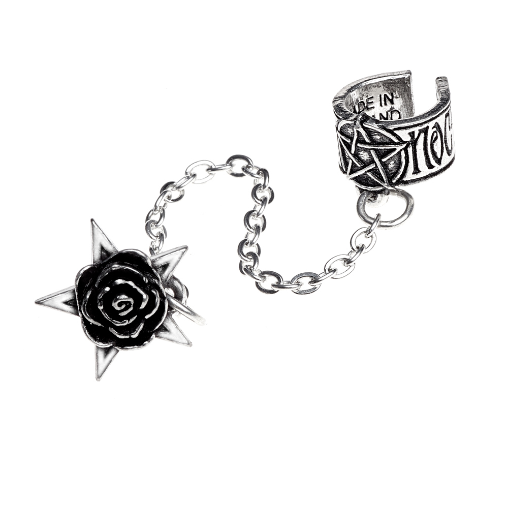 Амурные магические свойства комбинированной пентаграммы и черной розы столь же туманны, сколь и могущественны, с мифами, предполагающими контроль над будущими влюбленными, до вызова демона Принца Ситри. Одноименная манжета с пентаграммой для верха уха, прикованная к пентаграмме, украшена черной розой. Манжета слегка сжимается, чтобы удобно закрепиться вокруг уха. Вес и размеры: H: 98 мм (3,86 дюйма) W: 16 мм (0,63 дюйма) D: 17 мм (0,67 дюйма) Вес: 7 г (0,25 унции).