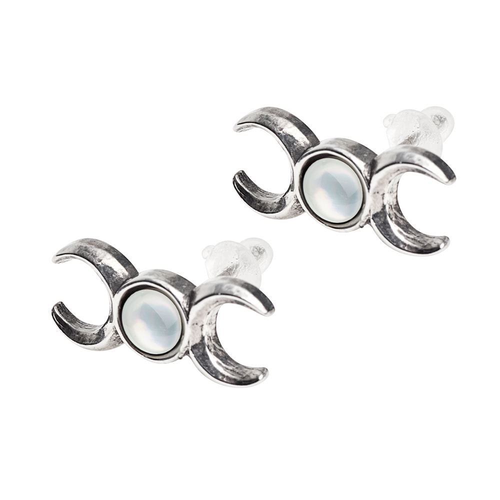 Жемчужная полная луна, окруженная убывающими полумесяцами, символизирует Триединую Богиню Викки; Девушку, Мать и Старуху, призывающую, среди прочего, к исцелению, оккультной защите, совершенству и богатству. Небольшая и сдержанная пара сережек в форме трех фаз Луны, с маленькой перламутровой полной луной кабошоном в центре. Крепление - гвоздики из хирургической стали и силиконовая заглушка. Вес и размеры: В: 9 мм (0,35 дюйма) W: 19 мм (0,75 дюйма) Д: 16 мм (0,63 дюйма) Вес: 4 г (0,14 унции).