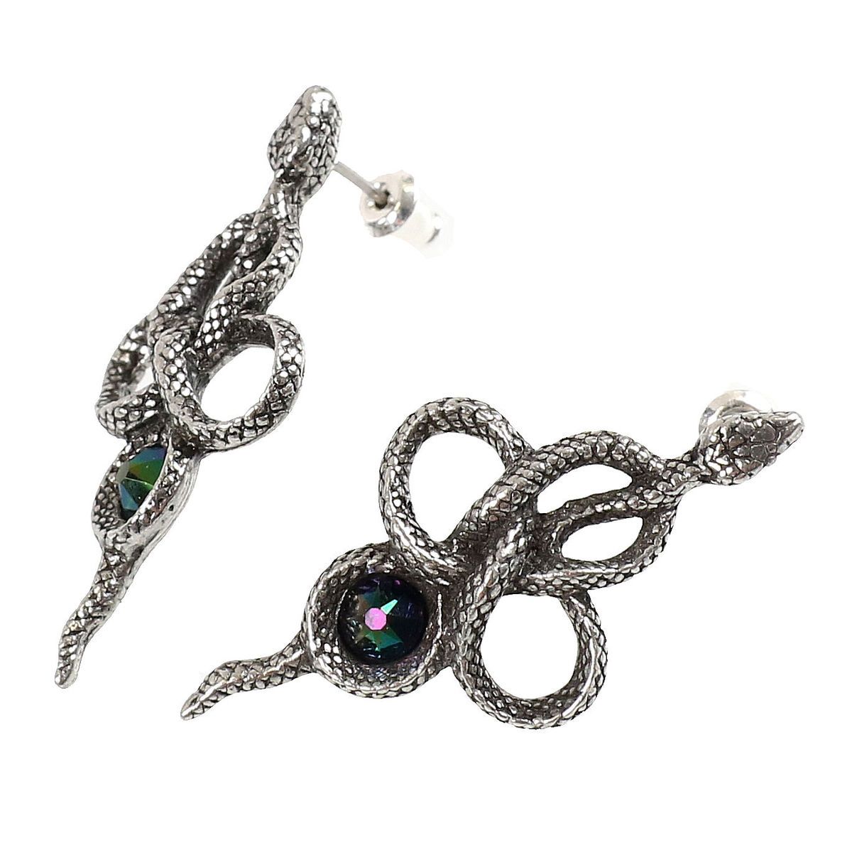 Эти серьги в форме змей, каждая из которых имеет три завитка, символизируют викканское Правило Трех; что вся энергия, транслируемая в мир - положительная или отрицательная - возвращается отправителю в тройном размере. Пара изящных сережек из пьютера в виде узелков из змей украшены темным кристаллом. Крепление и упаковка: пара серег, упакованных в фирменный пакетик Alchemy, включая гарантию Alchemy и инструкции по уходу. Материалы и происхождение: разработаны и изготовлены вручную в Англии из тонкого английского пьютера с замочком из хирургической стали и кристаллом. Цвета кристаллов зависят от наличия и могут отличаться от представленных на картинке.