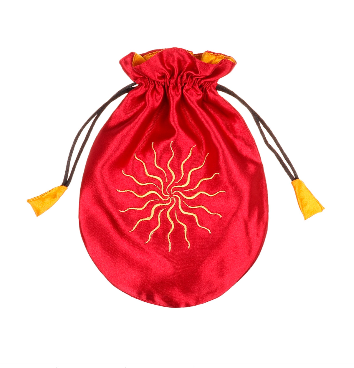 Мешочек для карт, изготовленый из качественной атласной ткани и имеющий внутреннюю подкладку, изготовлен в Англии дизайнерами бренда Eastgate. Наши прекрасно выполненные атласные мешочки для Таро украшены вышивкой с магическими символами и подкладкой дополнительных цветов. Каждый мешочек закрывается на шнурок, а подкладка отделана вручную. Эти оригинальные мешочки достойны даже самого взыскательного владельца Таро.