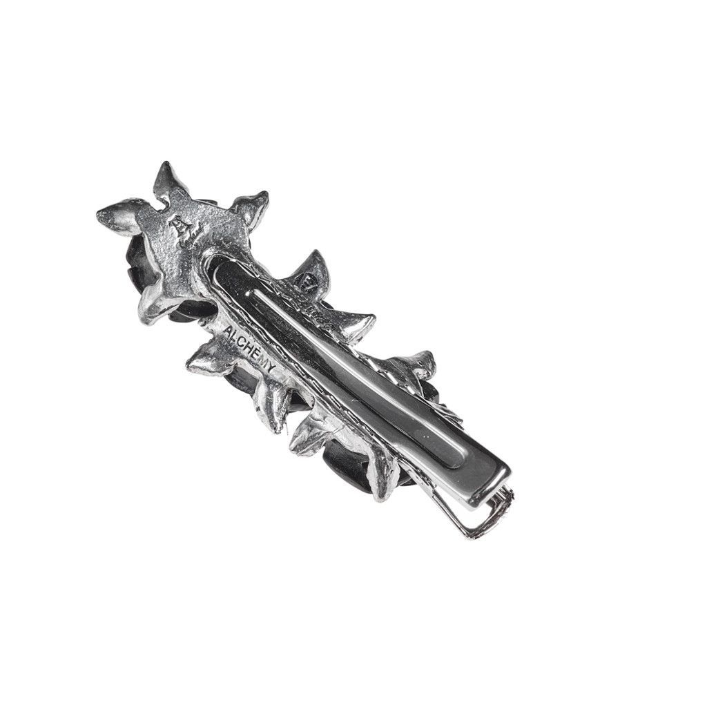 Заколка-зажим ДИКАЯ ЧЕРНАЯ РОЗА. Сочетание нетронутых цветов насыщенного оттенка - предзнаменование любовных желаний из глубины теней. Элегантная готическая заколка для волос для истинных романтиков. Зажим для волос выполнен в виде ряда из трех роз изготовленных из английского пьютера с соцветиями покрытыми черной эмалью, на 2 см зажиме из нержавеющей стали. Заколка-зажим для волос упакован в фирменный пакет Alchemy, включая гарантию Alchemy и инструкции по уходу. Разработана и изготовлена вручную в Англии из английского пьютера.
