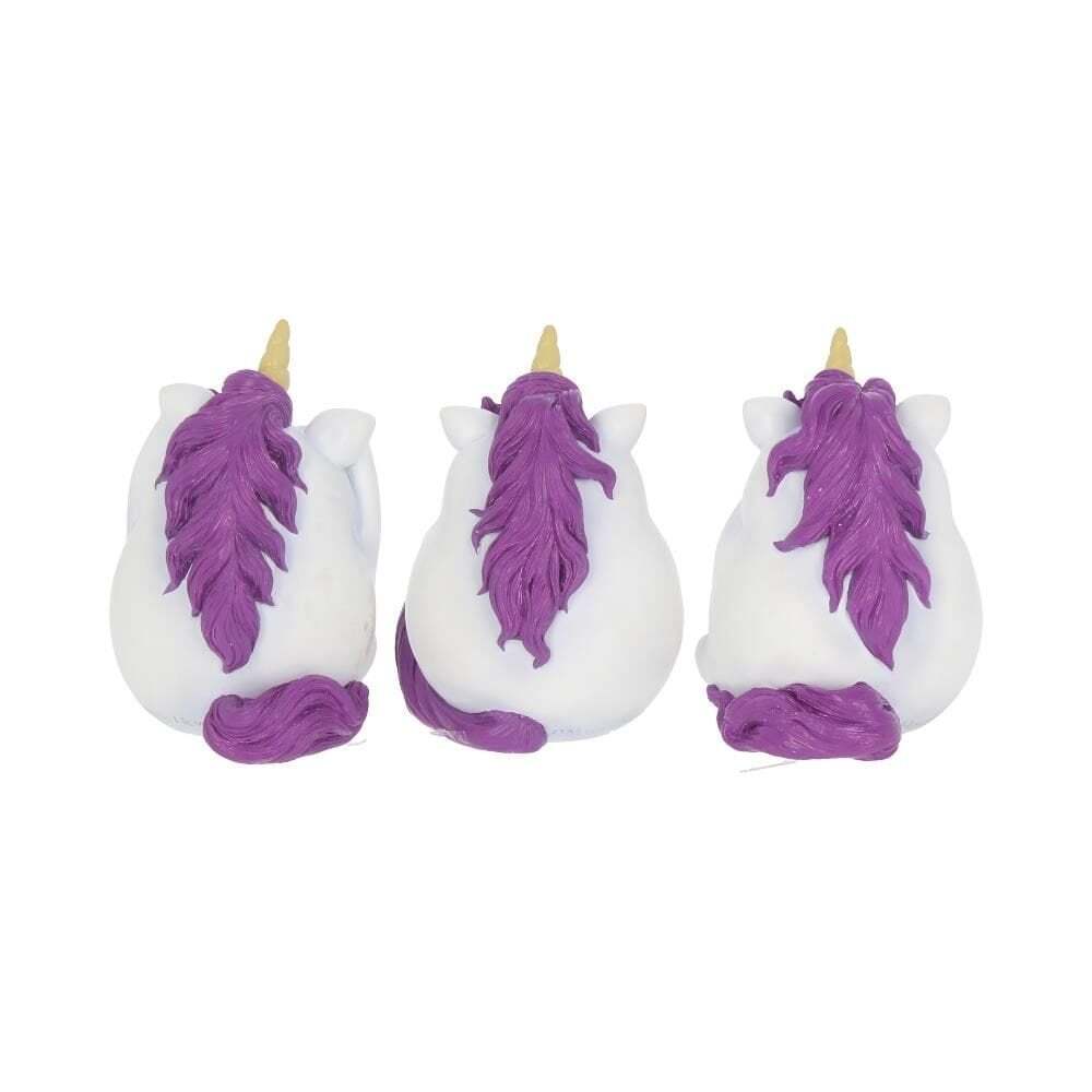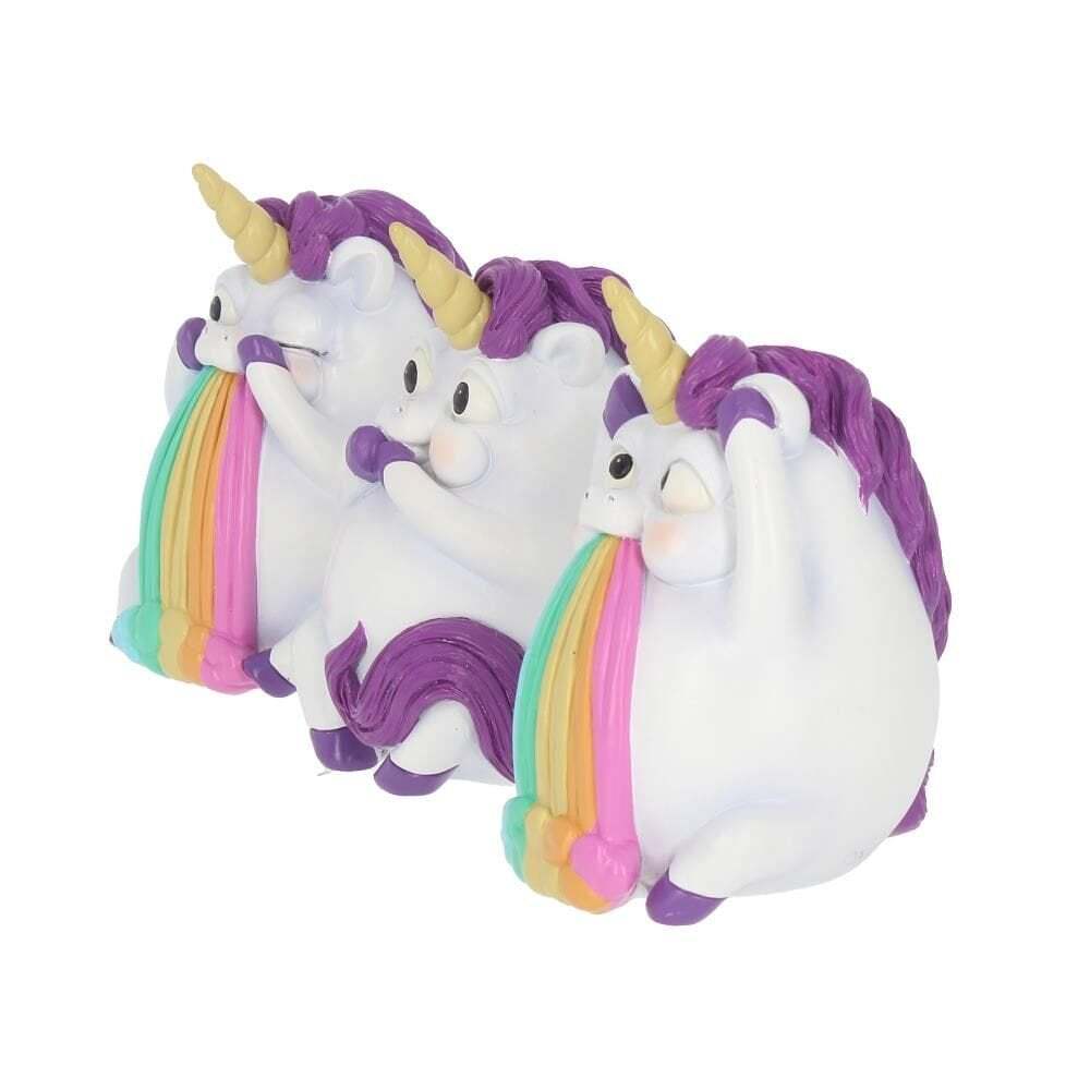 Это трио единорогов создано командой дизайнеров Nemesis Now. У этих трех пухлых белых единорогов фиолетовые гривы, хвосты и копыта, но, похоже, они съели слишком много леденцов. Один прикрывает глаза копытами, когда из него извергается поток радуги, другой с недоверием хватается за голову, зажимает копытами уши, а третий отчаянно держит рот закрытым. Отлитое из тончайшей смолы перед тем, как их мастерски раскрасили вручную, это трио воплощает в себе благородную мудрость Конфуция: не видеть зла, не слышать зла, не говорить зла - хотя, возможно, не так, как он имел в виду!