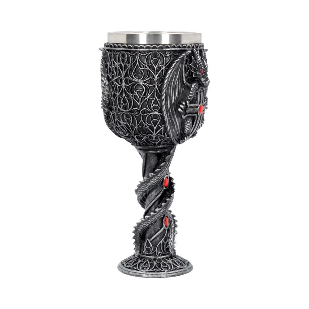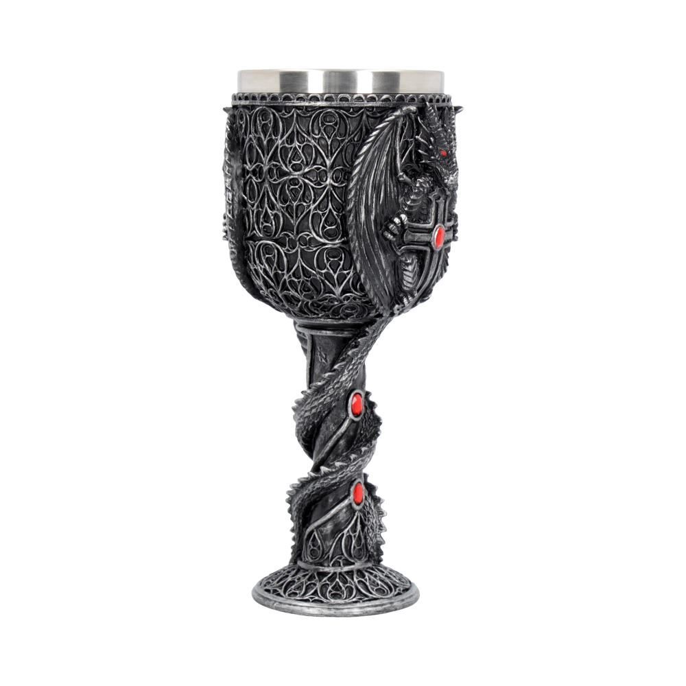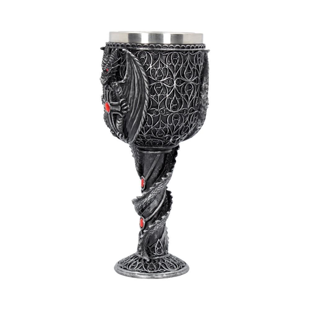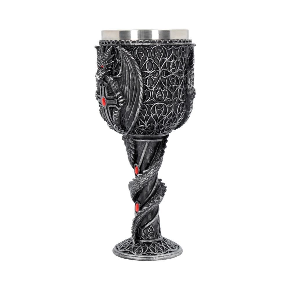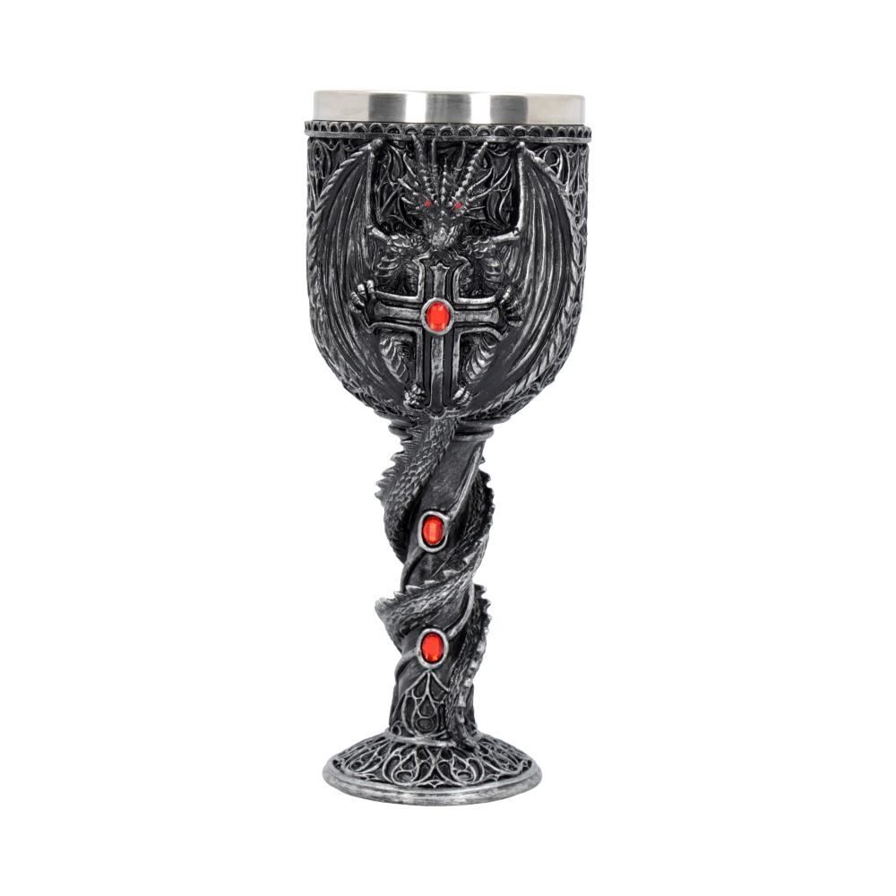 Этот кубок был создан талантливыми дизайнерами бренда Nemesis Now. Ножку этого кубка обвивает дракон своим хвостом. Опираясь на него, корпус кубка украшен изображением дракона распустившим крылья и обнимающим крест, инкрустированный драгоценностями. Отлитый из тончайшего полистоуна, а затем тщательно расписанный вручную, этот кубок поставляется со съемной вставкой из нержавеющей стали для удобства очистки. Предназначен для использования по прямому назначению, а так же в декоративных целях. Мыть только вручную. Объем бокала - 200 гр.