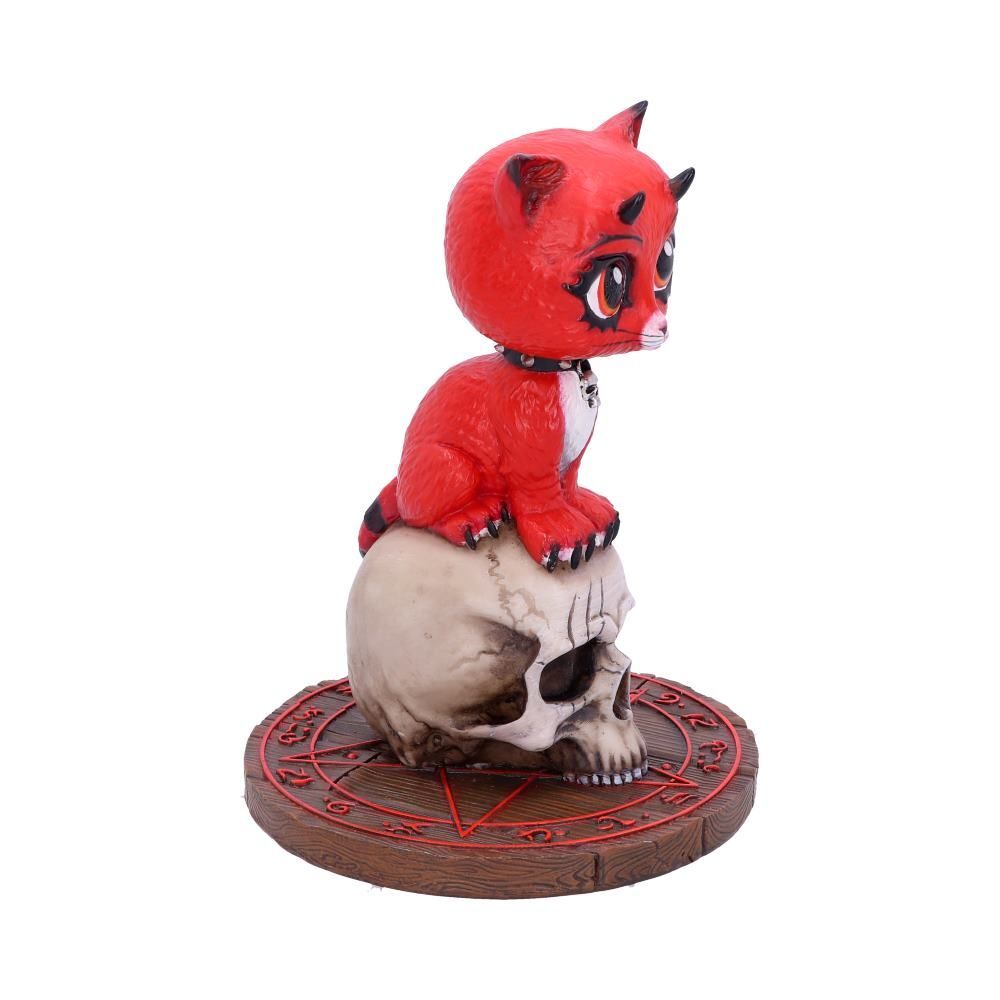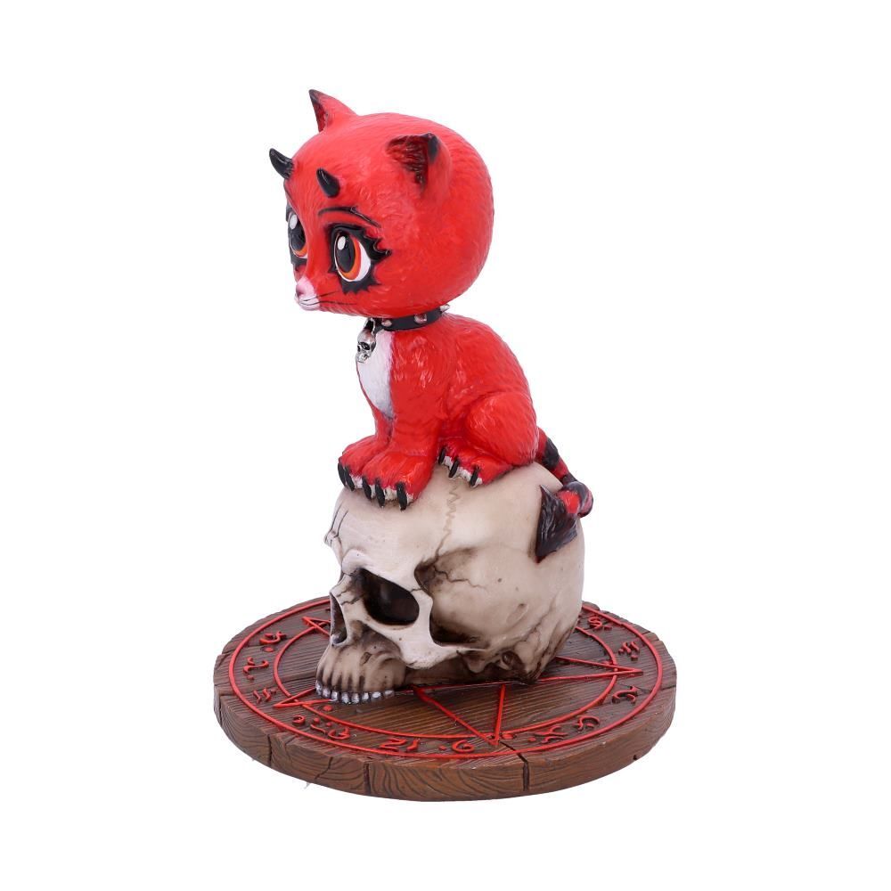Этот котенок очарователен, но смертельно опасен! Из его головы торчат небольшие рожки, а огромные красные глаза будто смотрят в душу. На шее кота красуется ошейник с шипами и подвеской, а на черепе - длинные темные когти. Череп установлен над основанием в виде перевернутой пентаграммы, как будто его только что вызвали из подземного царства. Отлитый из тончайшего полистоуна и раскрашенный вручную, этот предмет станет фантастическим подарком для тех, кто хочет постичь свою темную сторону. 16 см.