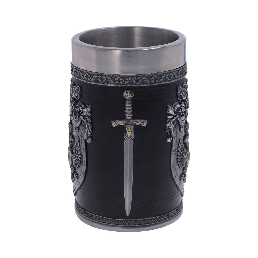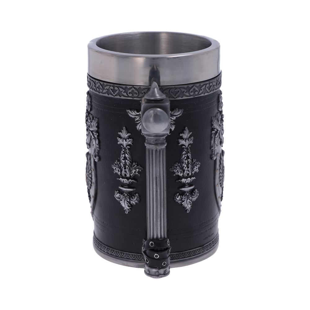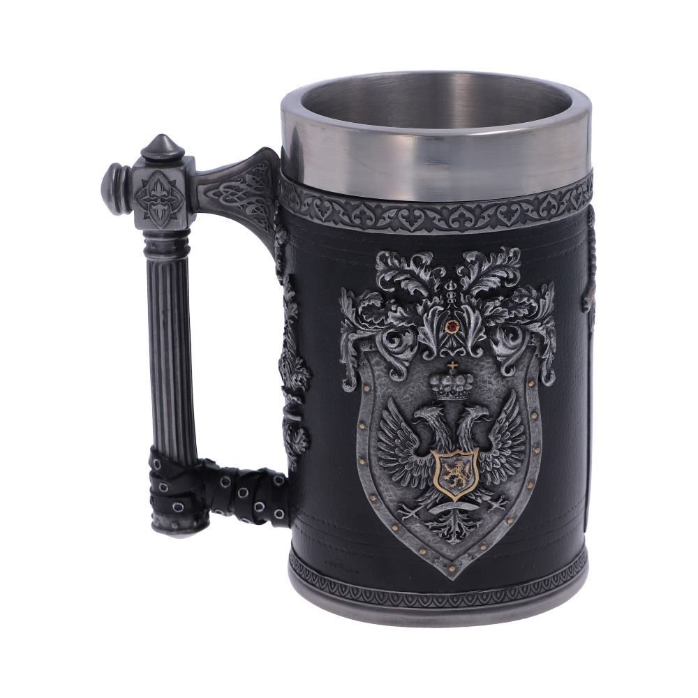 Отпразднуйте взлет и падение империй с помощью этого готического сосуда. Корпус этого сосуда насыщенного, без блеска черного цвета. На его боковой стороне изображен сложный герб с двумя хищными птицами и инкрустированной короной над ними. Ручка представляет собой демонстративный боевой топор, символизирующий силу и славу империй. Этот танкард поставляется со съемной вставкой из нержавеющей стали для удобства чистки. Это изделие предназначено для декоративного использования.