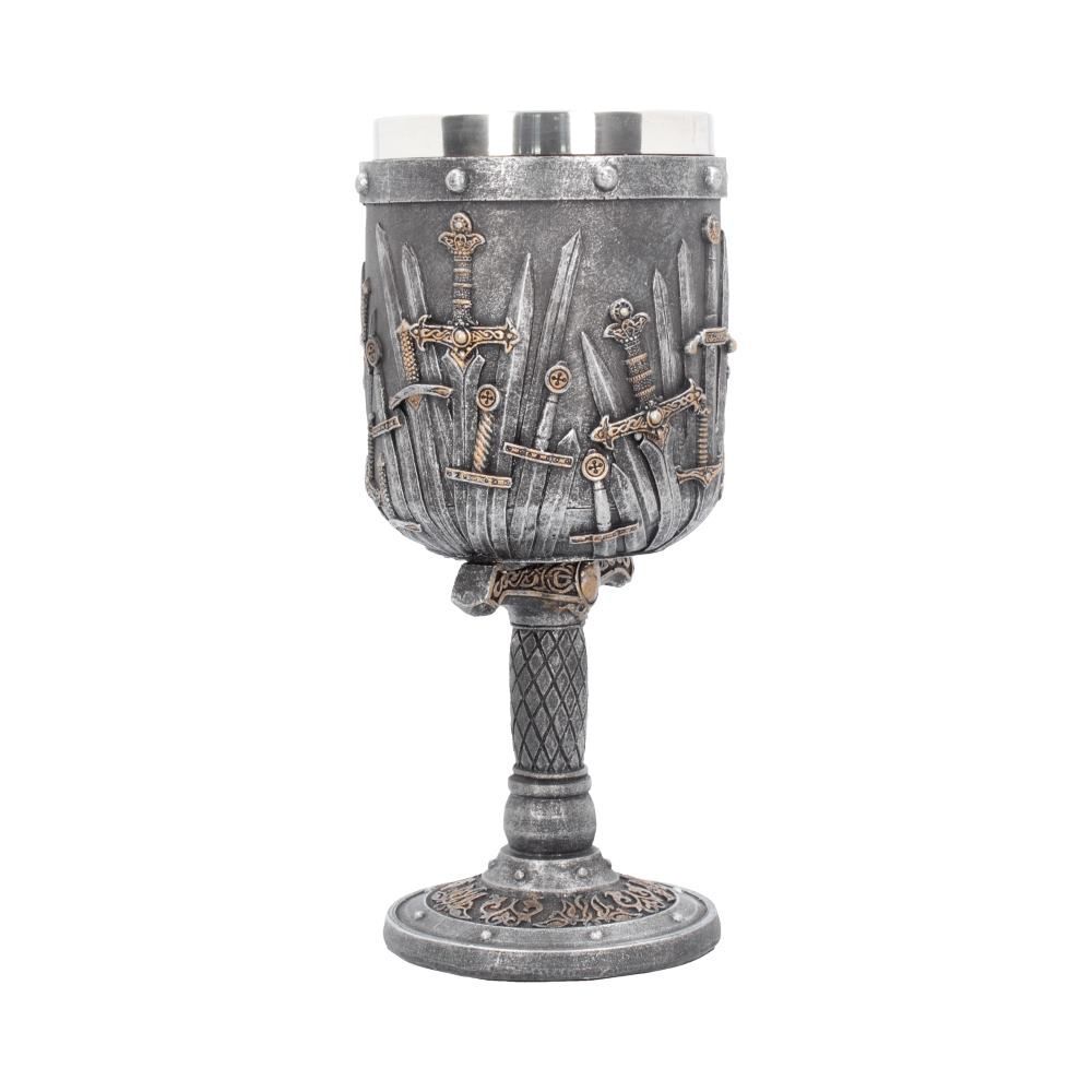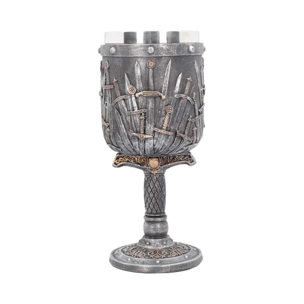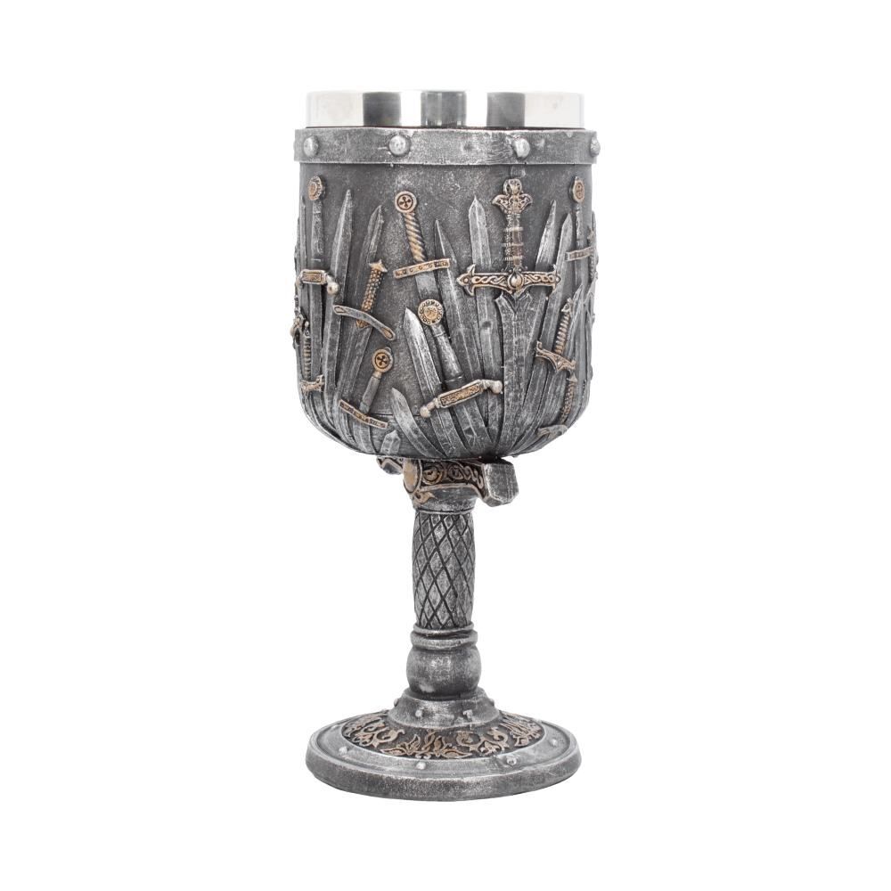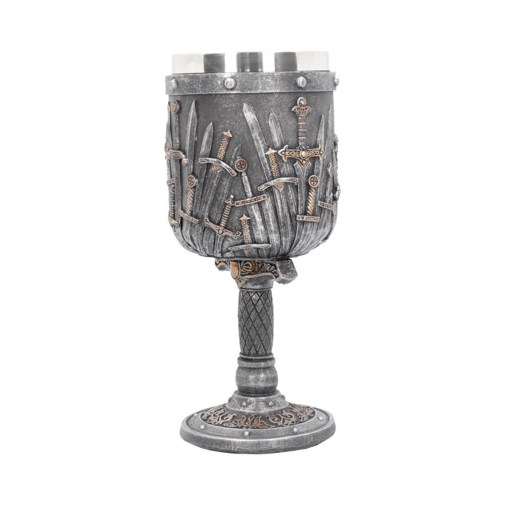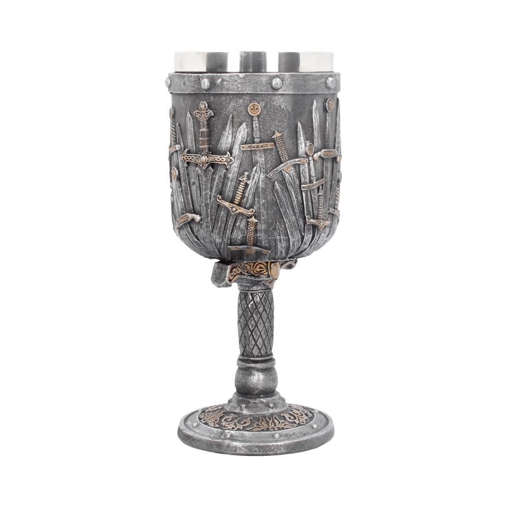 Подарите подарок, достойный короля, с помощью этого удивительного кубка "Меч короля" из коллекции подарочной посуды альтернативного бренда Nemesis Now! Кубок, украшенный мечами с разными рукоятками и лезвиями, стоит на гарде и рукояти большего меча.