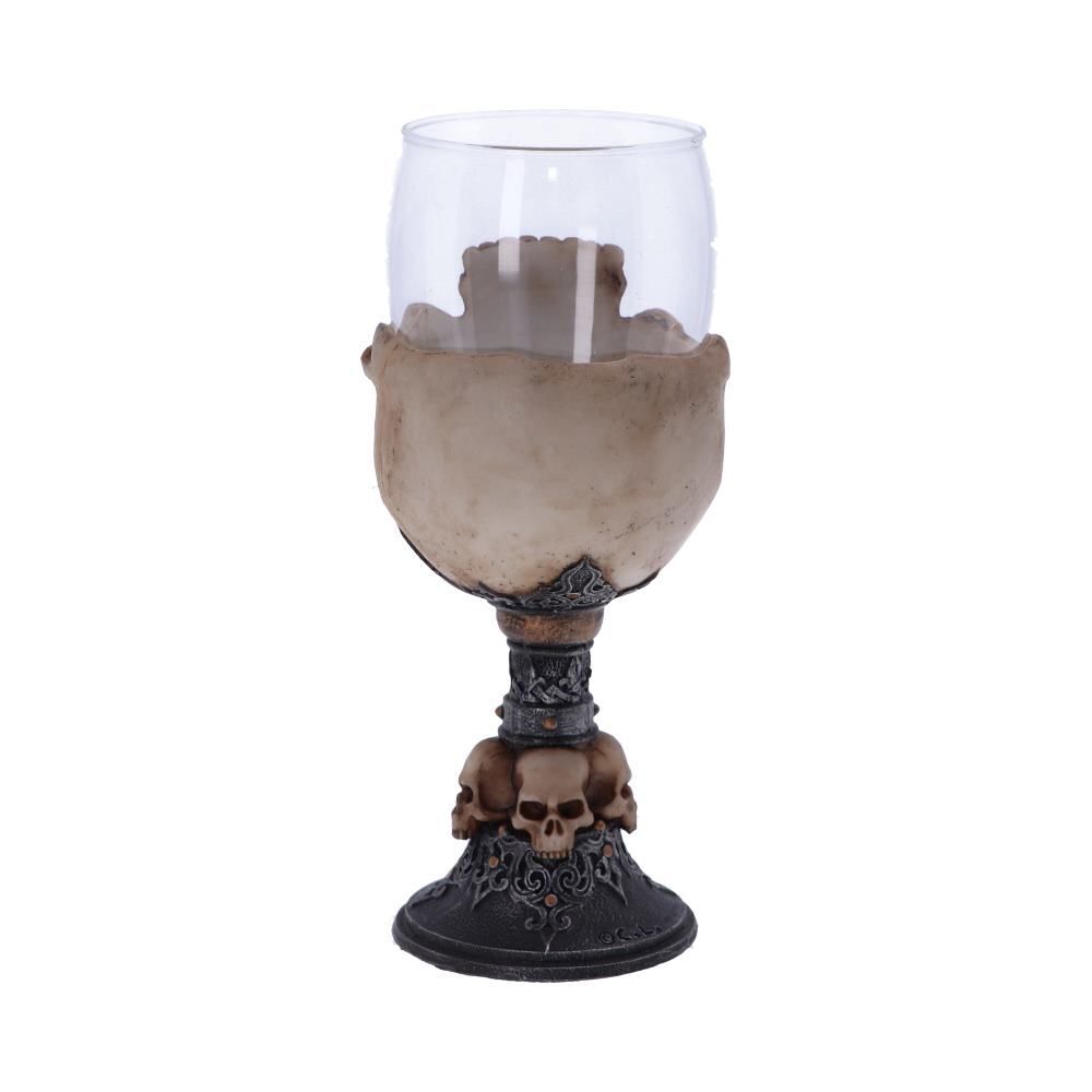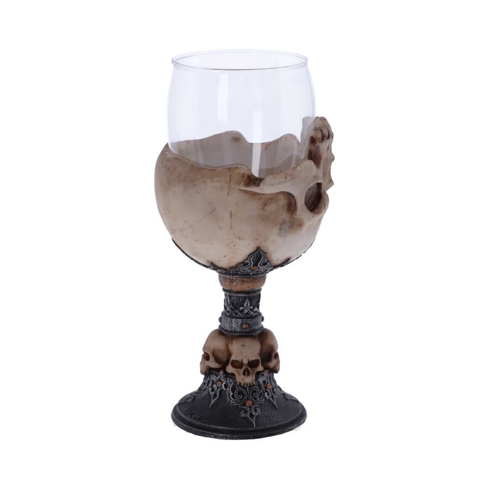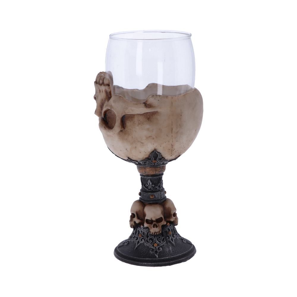 Черный бокал из подземного мира выполнен в виде черепа, который удерживает прозрачный сосуд для напитка. На ножке кубка находятся несколько черепов поменьше, богато украшенные замысловатыми узорами с бронзовыми деталями.