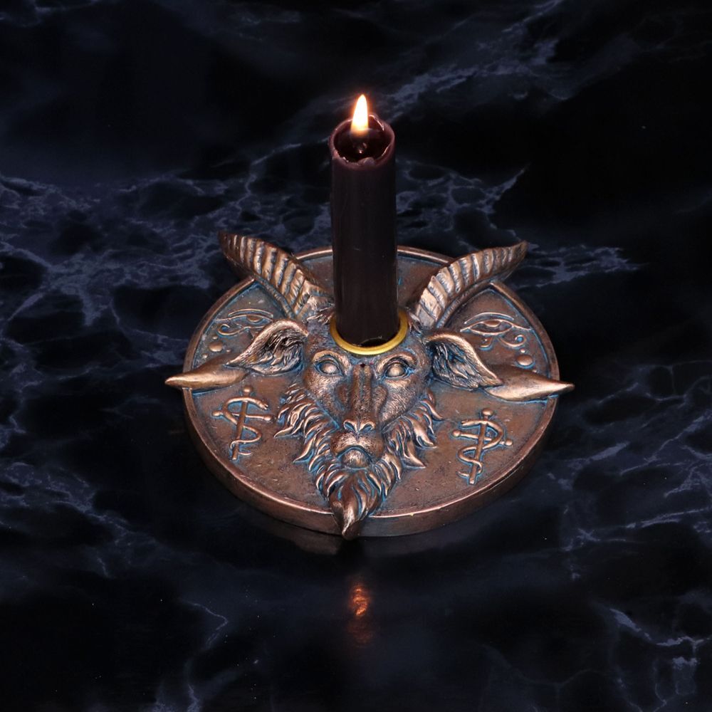 Этот искусно изготовленный подсвечник/горелка для благовоний Baphomet Incense burner представлен альтернативным брендом Nemesis Now. Украшенный лицом могущественного Бафомета, этот небольшой круглый держатель также имеет изображение посоха Асклепия и глаза Гора. В центре головы Бафомета находится небольшое блюдо, куда можно поставить любимую свечу, и маленькое отверстие для сжигания благовоний. Отлитый из тончайшей смолы, а затем искусно расписанный вручную, этот предмет идеально подходит для тех, кто хочет призвать Бафомета, чтобы привнести баланс в свою жизнь.