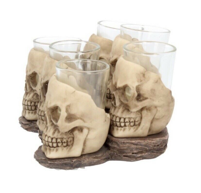 Выпейте с ушедшими в мир иной из одной из шести оригинальных стопок! На каменном основании стоят великолепные черепа, они смотрят из другого мира и зловеще усмехаются. Шесть рюмок ждут, пока вы попробуете на вкус вечность! Стопки отлиты из высококачественной смолы и искусно раскрашены вручную. Размер изделия 10 см вес 1,2кг