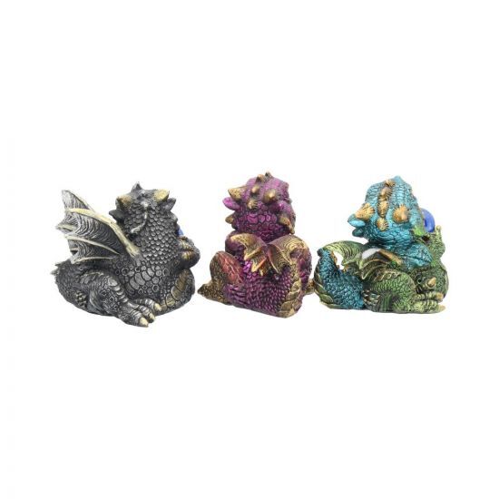 Отлитые из тончайшего полистоуна и с любовью расписанные вручную, эти драконы станут прекрасным дополнением к дому любого любителя фантастики. Каждый из них держит большую сферу. Эти драконы представлены в 3 разных цветах, их можно выставлять вместе или разделить на отдельные подарки. Три фигурки в комплекте. 7 см.
