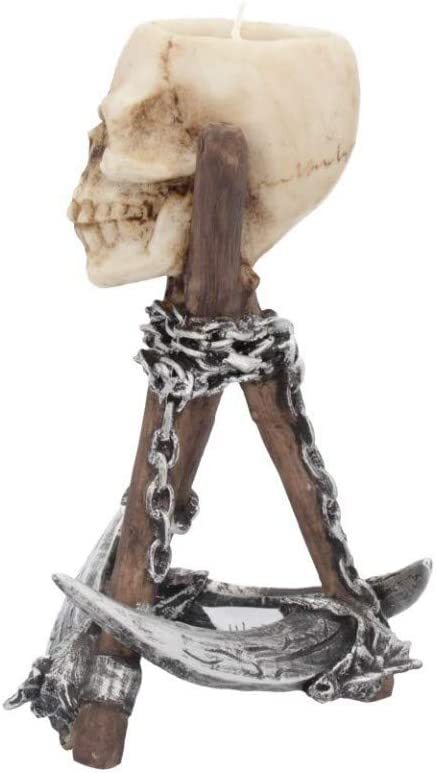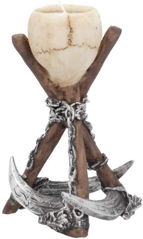 "Осветите путь к переходу в мир иной этим подсвечником для чайных свечей Scythe Skull, доступным как часть коллекции альтернативной подарочной продукции Nemesis Now Alator. Верхняя часть подсвечника сделана в форме черепа, балансирующего на вершине трех кос, скованных цепью. Лезвия кос составляют основу. Этот подсвечник, отлитый из высококачественной смолы и с любовью расписанный вручную, станет идеальным украшением готической каминной полки. Размер изделия 15,8 см вес 0,4кг "