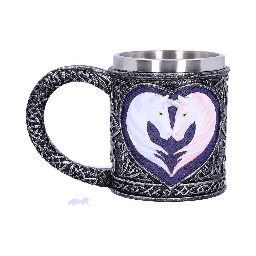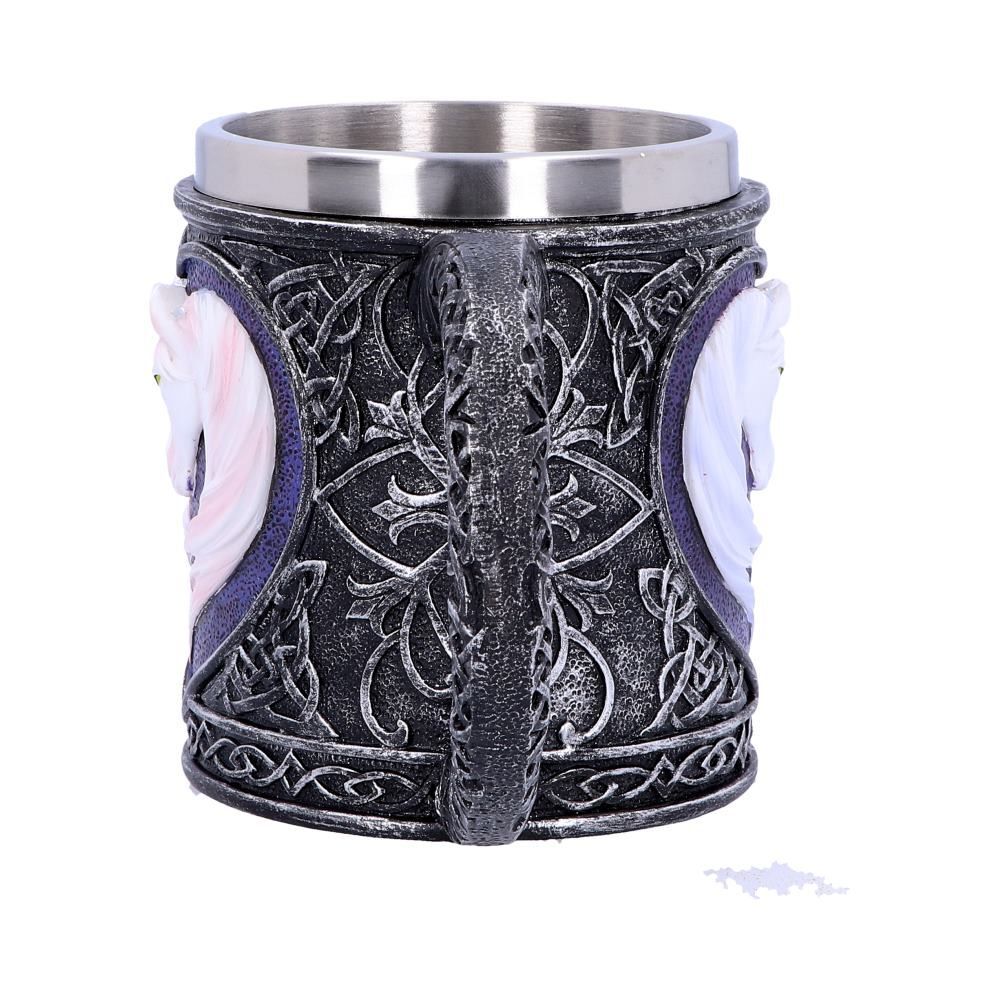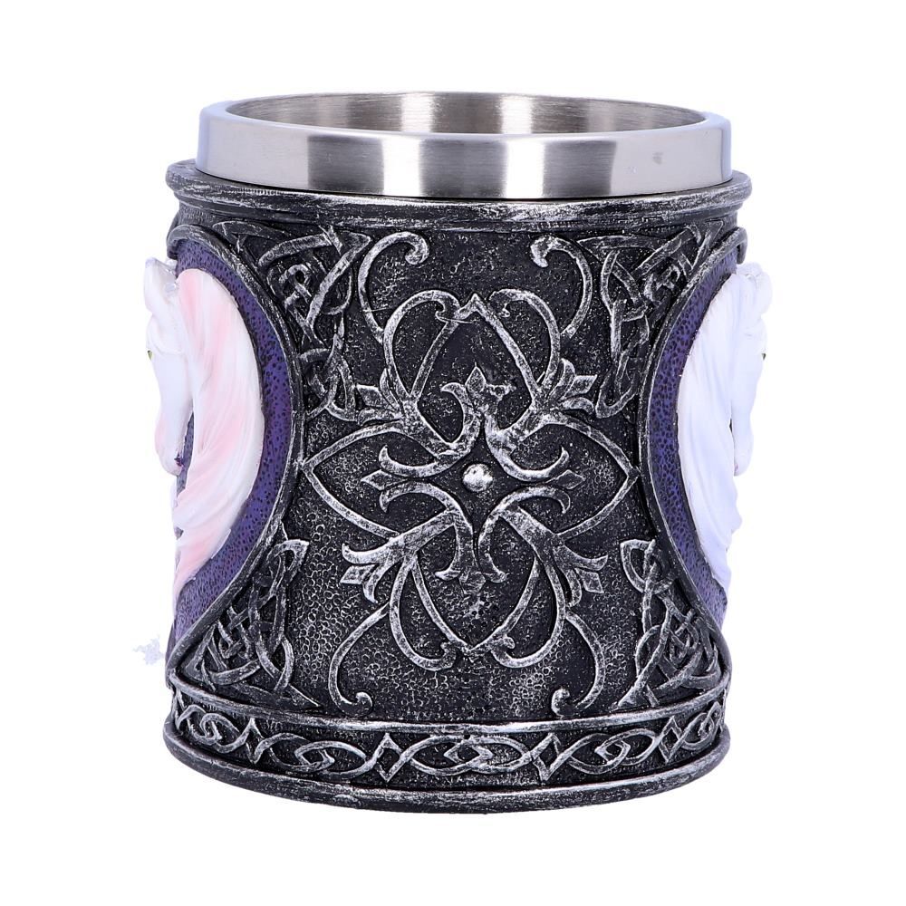 Серый металлик с витиеватыми серебряными узорами по всей поверхности, этот бокал в стиле фэнтези имеет красиво украшенную кельтскую ручку. На корпусе бокала изображен профиль пары белых единорогов, наложенных на фиолетовый фон и образующих мистическое сердце. Со съемной вставкой из нержавеющей стали для удобства очистки, этот бокал станет идеальным подарком для любого любителя фантастики и пива.