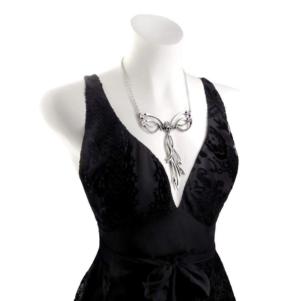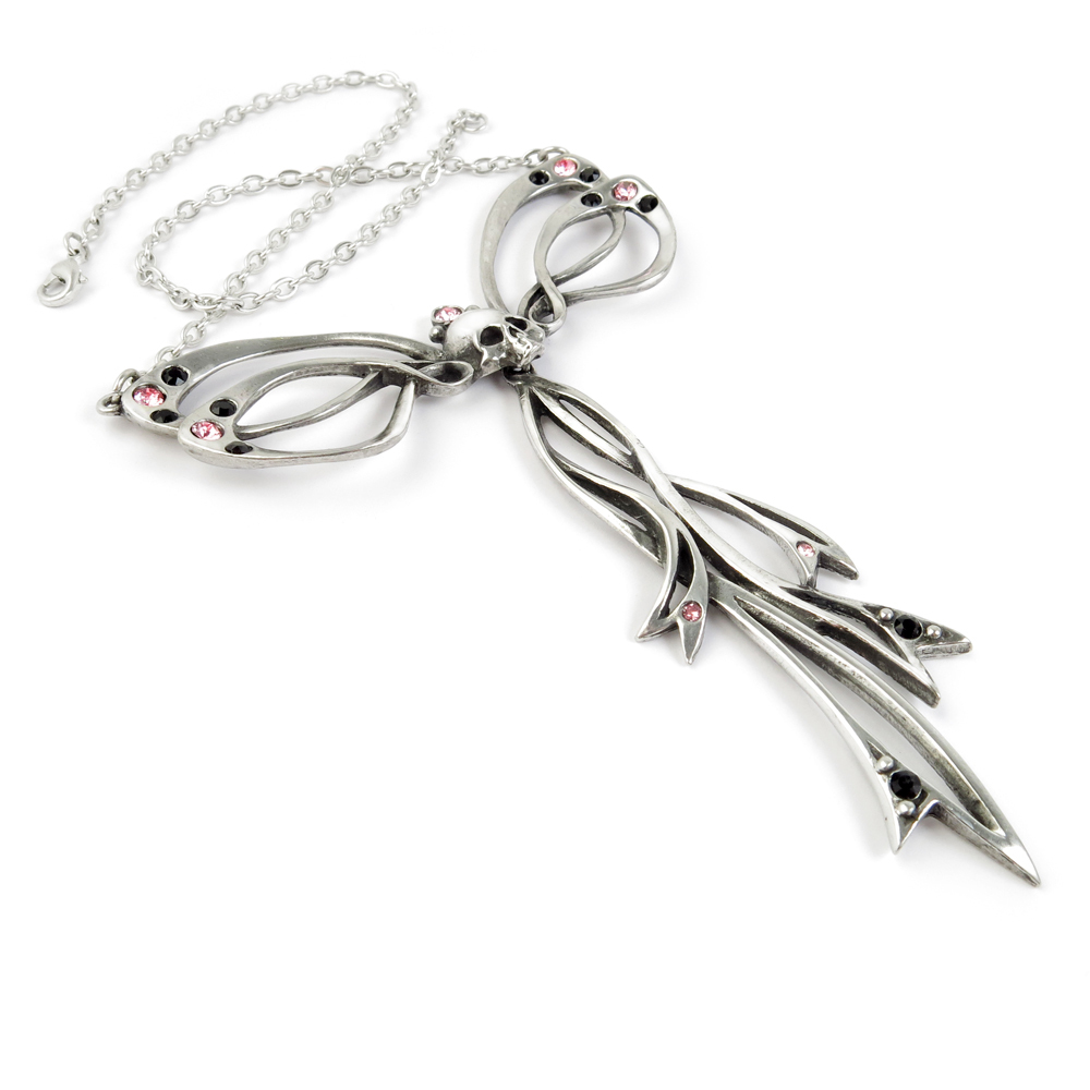 Раскошная форма банта с оттенком романтической темноты: ленты с черепом и кристаллами Swarovski.Размеры 4: 9 см * 12 см. На цепи (размер регулируется от 37 до 41 см). В подарочной упаковке: на черной бархатной подложке в черном полупрозрачном мешочке.