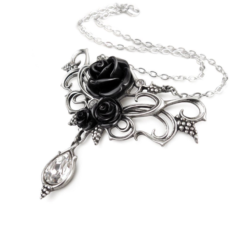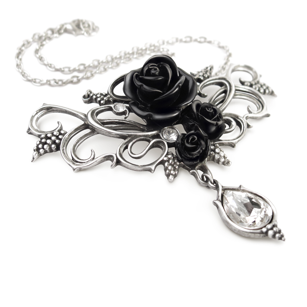 Роскошное ожерелье в романтическом стиле стилизовано виноградными лозами, окружающими три черных розы и украшено прозрачным кристаллом Сваровски. Роскошное ожерелье с романтическим мотивом, скрывающее или раскрывающее тайную страсть к вину и чувственным удовольствиям; черные розы для темной любви и виноградные лозы для наслаждений. Богато украшенное ожерелье из запутанных виноградных лоз окружает три черные розы и каплю прозрачного кристалла Swarovski. Вес и размеры (приблизительно): H: 85 мм (3,35 дюйма) W: 99 мм (3,90 дюйма) D: 19 мм (0,75 дюйма) Вес 55 г (1,94 унции)