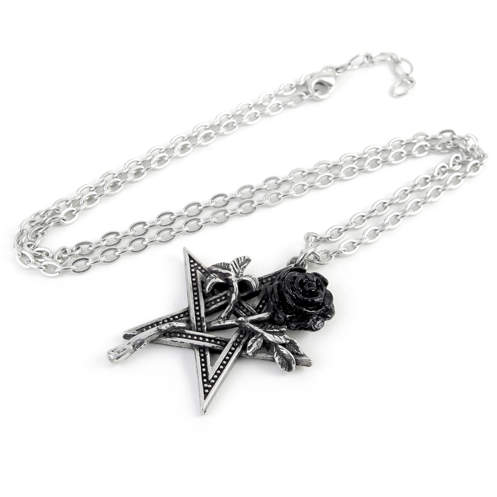 Подвеска Пентаграмма и черная роза. Пентаграмма - это пятый элемент; дух и "Дыхание жизни", страстно переплетенные с романтической и чувственной розой верной любви, чтобы обеспечить здоровье, гармонию и мистические силы.