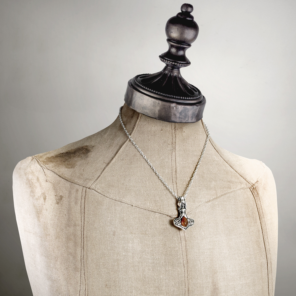 Подвеска в форме молота Тора украшена головой дракона и янтарем. Классический, вычурный и очень сложный языческий амулет силы и защиты, подходящий для высокопоставленного викингского лидера/военачальника.