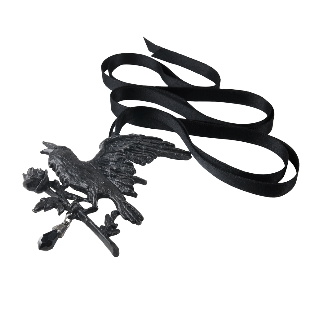 Подвеска Ворон в черном цвете с розой и черным кристаллом Сваровски на черной ленте. Черный: черный, как молодой ворон, с черной розой, подвешенной на черной ленте.