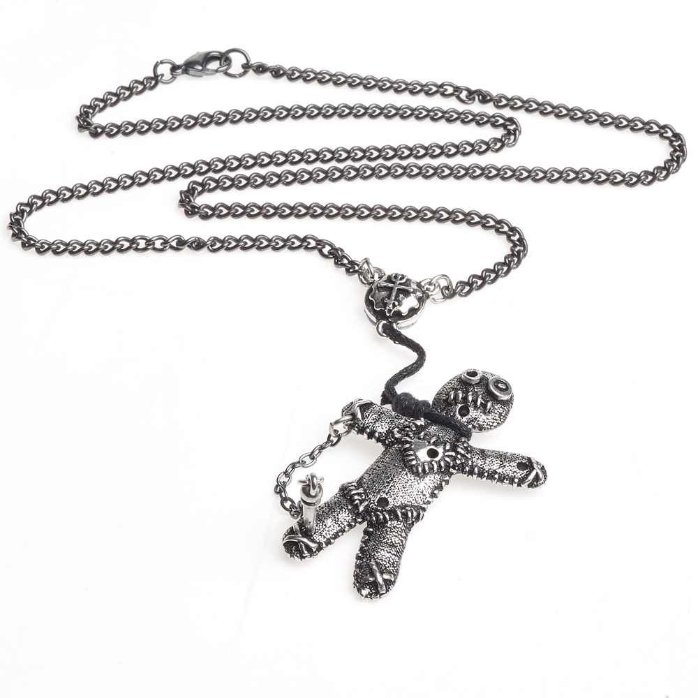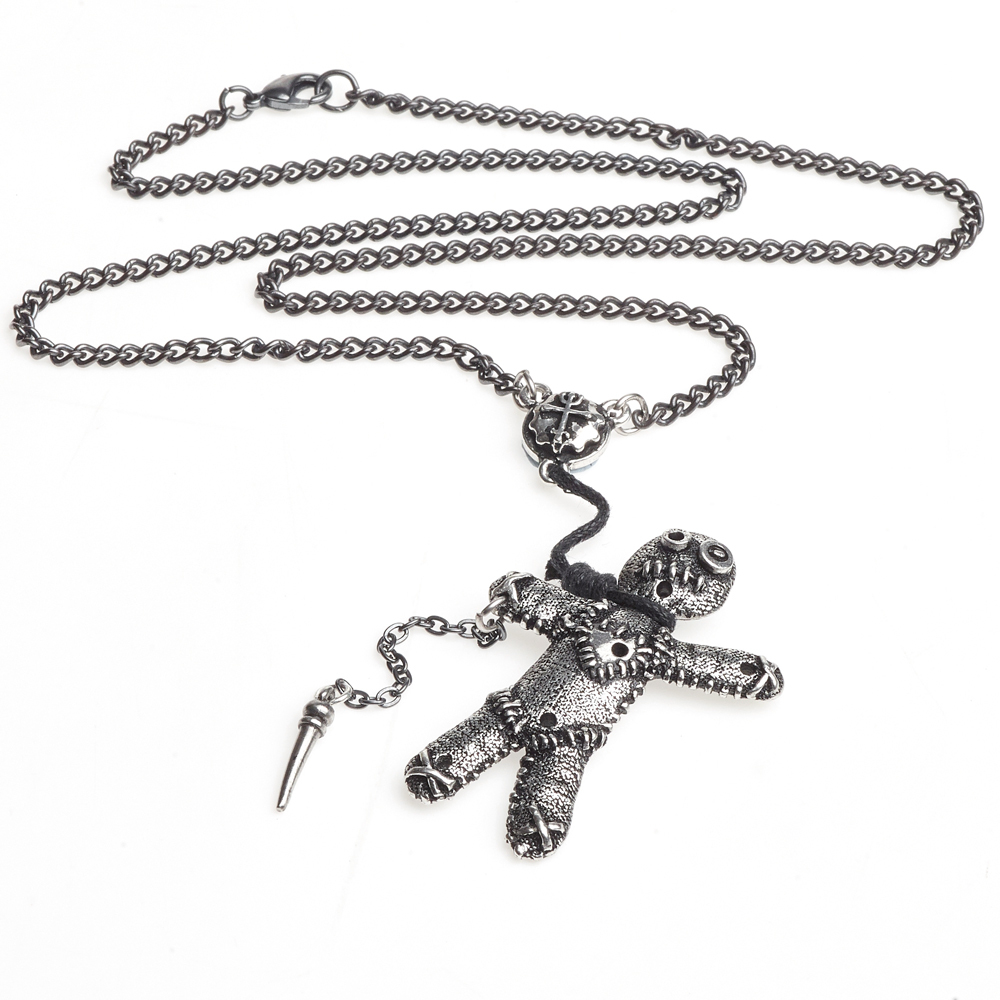 Предмет древнего происхождения, традиционный народный магический способ уничтожить силу ведьмы и с помощью гримуара нанести точную травму тем, кто против них... Старинный кулон куклы вуду с отверстиями для колышек в шести основных точках тела (глаз/голова, рот, сердце/легкие, пах/ живот, рука и нога), с черной цепочкой от правой руки, держащей колышек, чтобы пригвоздить куклу. Подвешенная к веревке палача из черного шнура, с символом вуду, на черной, 21"/48см цепи. Вес и размеры (приблизительно): H: 137 мм (5,39 дюйма) W: 37 мм (1,46 дюйма) D: 7 мм (0,28 дюйма) Вес: 31 г (1,09 унция)