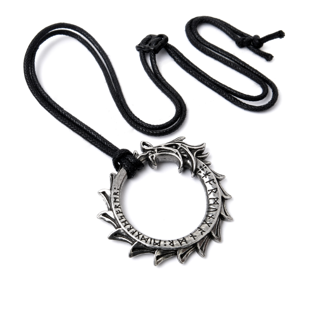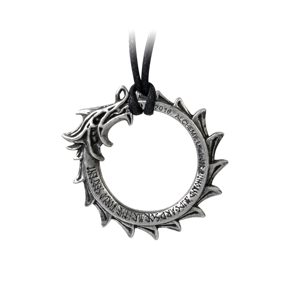 Дитя норвежского бога Локи, Йормунганд, "Змей Мидгарда" или Мировой Змей - величайший Уроборос. Окружая океан, который окружает мир; если "огромное чудовище" отпустит свой собственный хвост, миру придет конец. Тело змеи выгравировано рунами на лицевой стороне с надписью "Jormungandr Miogarosormr", что в переводе означает "Йормунгандр Мировой Змей". В норвежской мифологии Йормунганд, также известный как "Мидгардский змей" или "Мировой змей", является морским змеем, средним ребенком великанши Ангрбоды и Локи. Согласно Младшей Эдде, Один забрал троих детей Локи от Ангрбоды - волка Фенрира, Хелу и Йормунганда - и бросил Йормунганда в великий океан, окружающий Мидгард. Змей вырос настолько большим, что смог окружить землю и ухватиться за свой собственный хвост, и поэтому получил имя "Змей мира". Старинный кулон, змея-дракон в викингском стиле, кусающий собственный хвост, выполненный в виде кольца, и выгравированный спереди в руническом стиле, а на обороте - со змеиными именами. На черном шнуре, который регулируется черной застежкой из пьютера, до 26 дюймов (70 см) общей длины. Вес и размеры (приблизительно): H: 45 мм (1,77 дюйма) W: 49 мм (1,93 дюйма) D: 7 мм (0,28 дюйма) Вес: 19 г (0,67 унции)