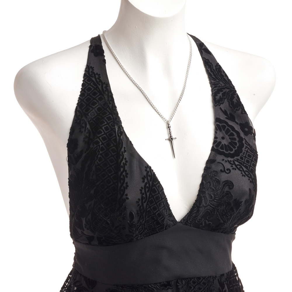 Остерегайтесь соблазна абсолютной власти - мегаломания приведет к вашему собственному падению. На клинке выгравировано "1606", год, когда Шекспир написал "Макбета", кровавая трагедия храброго шотландского лидера, движимого безжалостным стремлением к рецидивам, убийствам и тирании. Небольшой кулон в форме кинжала в стиле позднего средневековья с маленьким черным кабошоном на эфесе и гравировкой на лезвии. На цепочке 21"/48 см. Вес и размеры (приблизительно): H: 54 мм (2,13 дюйма) W: 17 мм (0,67 дюйма) D: 5 мм (0,20 дюйма) Вес: 14 г (0,49 унции)