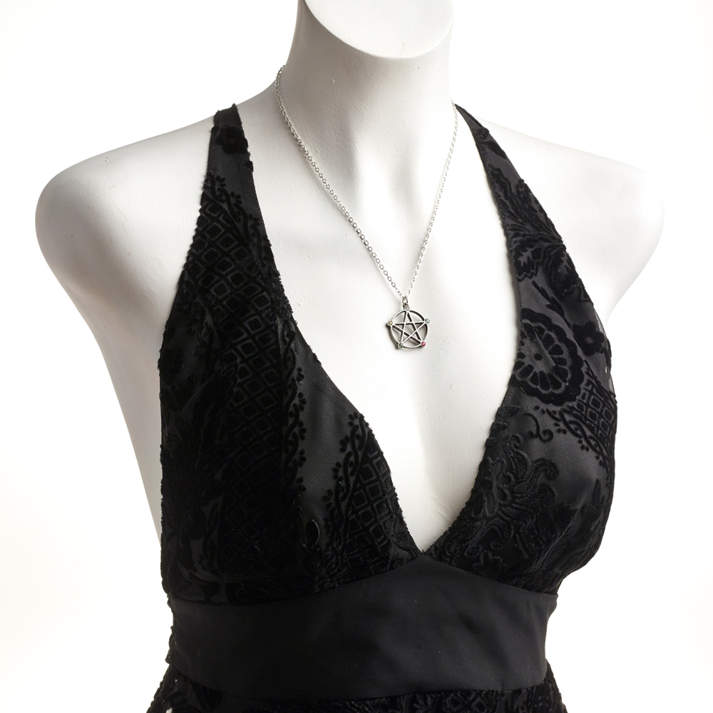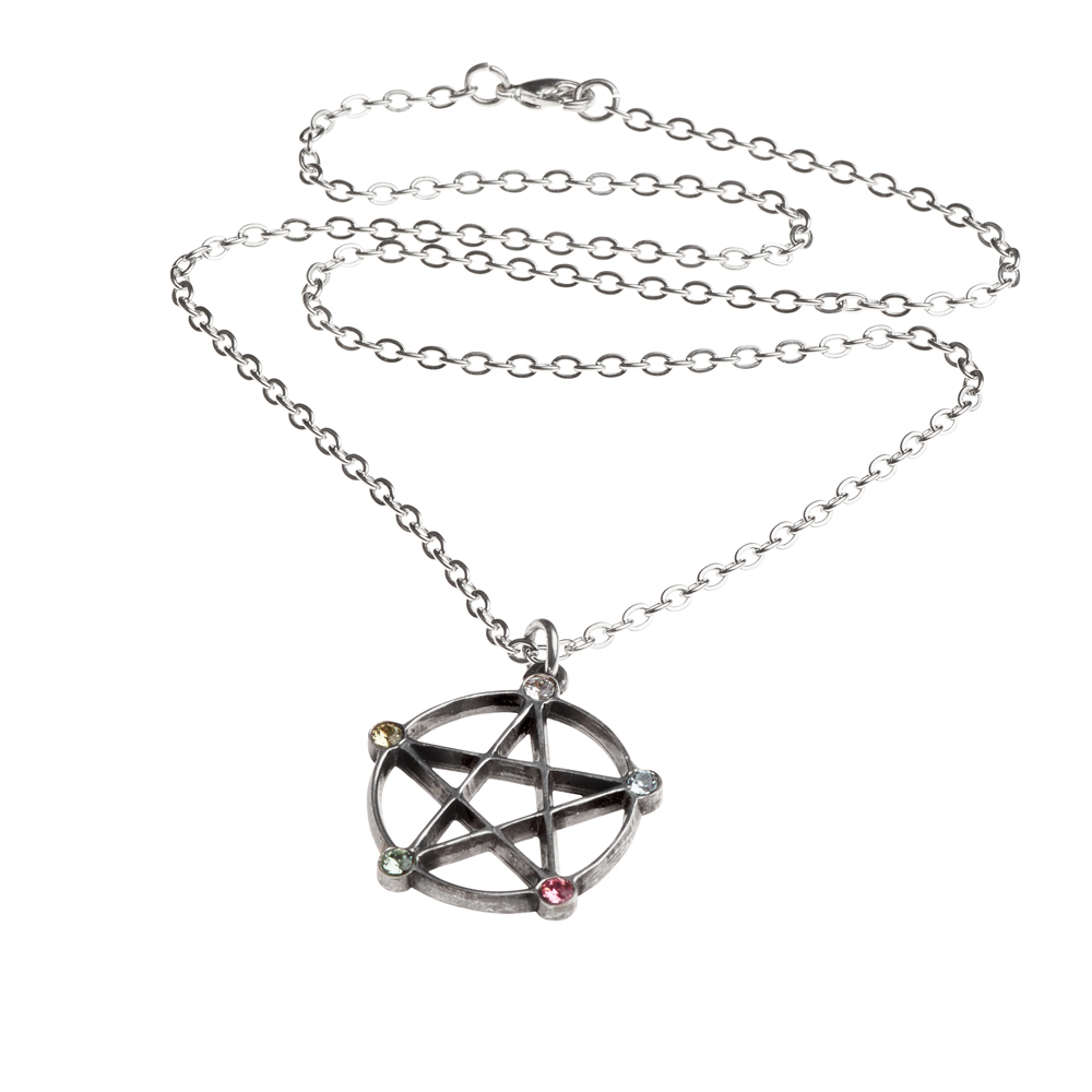 Подвеска Пентаграмма Викки - заключена в круг и украшена красталлами Сваровски. Викканский пентакль, представляющий пять элементов, пять чувств и пять точек священного человеческого тела, соединился в круг вселенной. Включает пять кристаллов Swarovski в пастельных тонах, которые в викканской традиции (происходят от "Золотого рассвета") ассоциируются с каждым из элементов: эфиром, водой, огнем, землей и воздухом (при этом эфир является белым, затем синим, красным, зеленым и желтым соответственно). Пентакль, или пятиугольник, также известен как символ Викки. Тонкий, лёгкий кулон с пентаграммой в круге с маленькими кристаллами Swarovski в каждой точке (небесно-голубой, шампанское розовое, чайно-зелёное, жасминово-жёлтое и прозрачный хрусталь), представляющий цвета пяти элементов; на 18-дюймовой (46см) тонкой цепочке. Вес и размеры (приблизительно): H: 34 мм (1,34 дюйма) W: 27 мм (1,06 дюйма) D: 4 мм (0,16 дюйма) Вес: 10 г (0,35 унции)