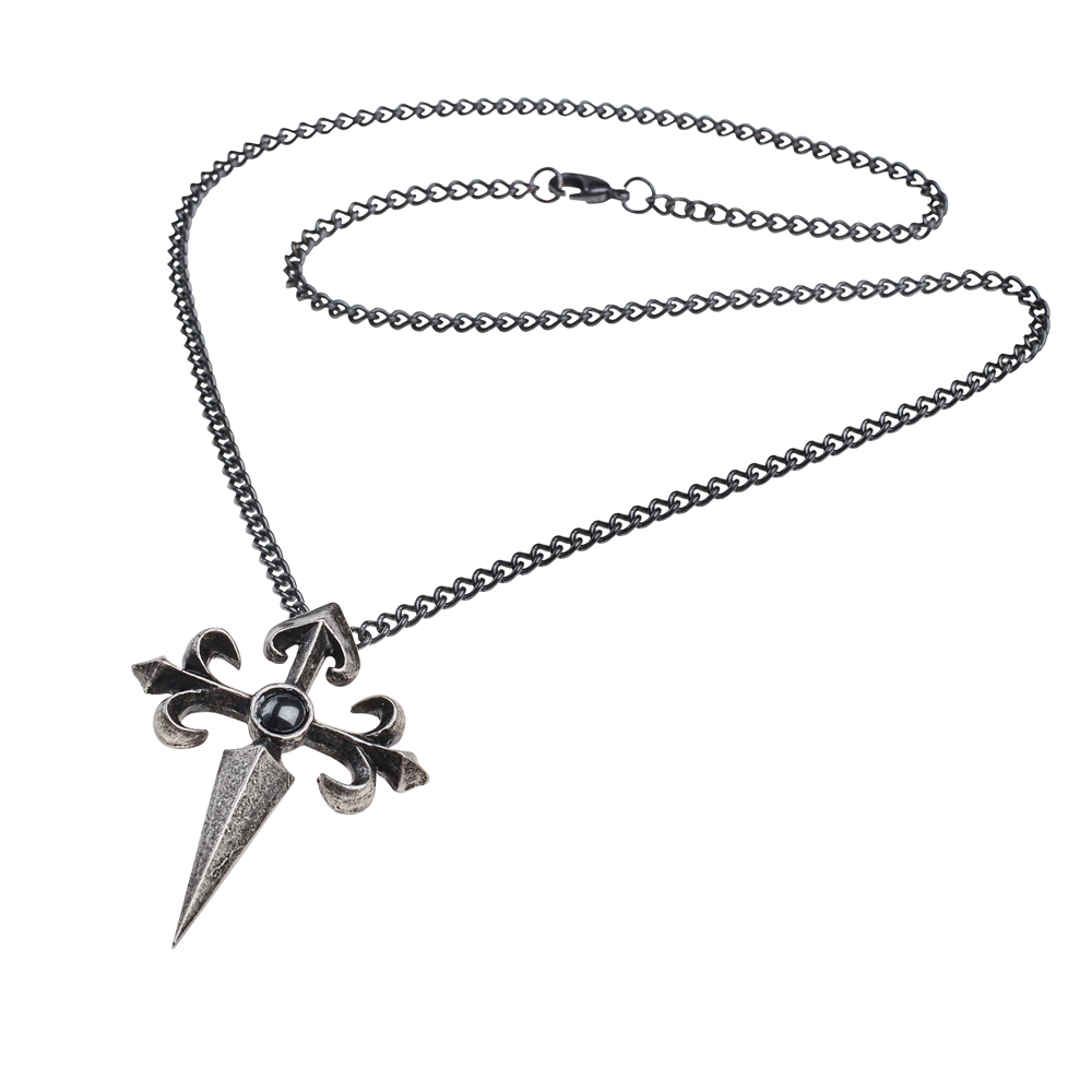 Повеление испанских рыцарей 12 века, Орден Святого Иакова Меченосца, поклялся защищать паломников и изгнать неверных. Подвеска изображает старинный крест в традиционном стиле, выполненная в рельефе флер-де-лис имитирует наконечник меча и его рукоять, а в центре - темный, круглый кабошон. На 21-дюймовой (53 см) черной цепочке. Вес и размеры (приблизительно): H: 54 мм (2,13 дюйма) W: 40 мм (1,57 дюйма) D: 10 мм (0,39 дюйма) Вес: 24 г (0,85 унции)