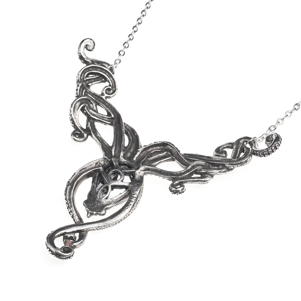 Чудовищные щупальца простираются к шее защищая свое сокровище. Еще мгновение и они перекроют приток кислорода. Большой, винтажный и полированный гигантский кракен, украшенный большим, переливчатым, грушевидным кристаллом Swarovski в центре. На разделенной цепочке 17" (43 см). Вес и размеры (приблизительно): H: 115 мм (4,53 дюйма) W: 119 мм (4,69 дюйма) D: 10 мм (0,39 дюйма) Вес: 89 г (3,14 унции)
