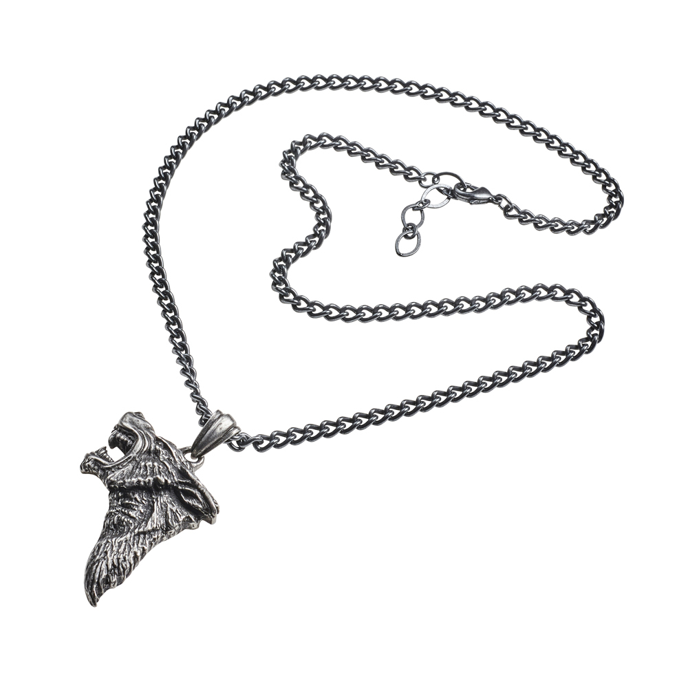 Подвеска Темный Волк в форме профиля свирепого волка с оскаленной пастью. Свирепость, исходящая от этого дикого зверя, ощутима для любого, кто только взглянет. Древний кулон в форме головы волка. На цепи ок. 21-дюймовой (53 см). Вес и размеры (приблизительно): H: 56 мм (2,20 дюйма) W: 34 мм (1,34 дюйма) D: 7 мм (0,28 дюйма) Вес: 36 г (1,27 унции)