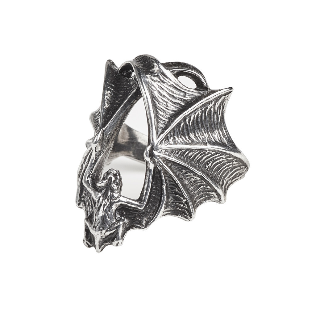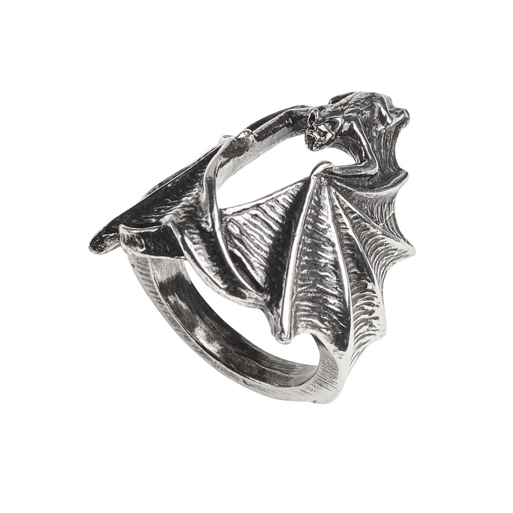 Под покровом ночи летучая мышь в абсолютной тишине приближается к намеченной добыче, чтобы удовлетворить свою жажду и полакомиться жертвой. Крупное античное литое кольцо в виде крадущейся летучей мыши с огромными распростертыми крыльями, охватывающими палец. Приблизительные размеры: Ширина 1,06 Высота 1,30 Глубина 1,30 Вес: 0,04 фунта. Материалы: Тонкий английский пьютер.