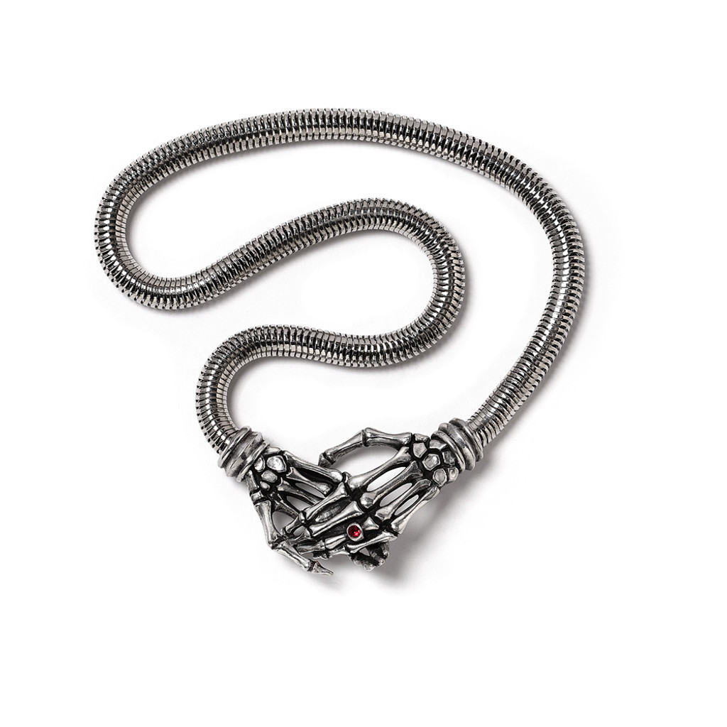 ВОЗЬМИ МЕНЯ С СОБОЙ. Смертельная преданность, вера и доверие должны быть выдержаны, чтобы следовать до самого конца. Это изысканное украшение станет экстраординарным акцентом любого наряда! Полированные руки скелета смыкаются на шее. Украшение инкрустировано красным австрийским кристаллом. Размер (приблизительно): На 18-дюймовой (46 см) 8-миллиметровой цепочке-змейке. Вес и размеры (приблизительно): H: 48 мм W: 53 мм D: 12 мм Вес: 93 г. Упаковано в черный мешочек из органзы, в который вложены гарантия Alchemy и инструкции по уходу. Разработано и изготовлено вручную в Англии из тонкого английского пьютера.
