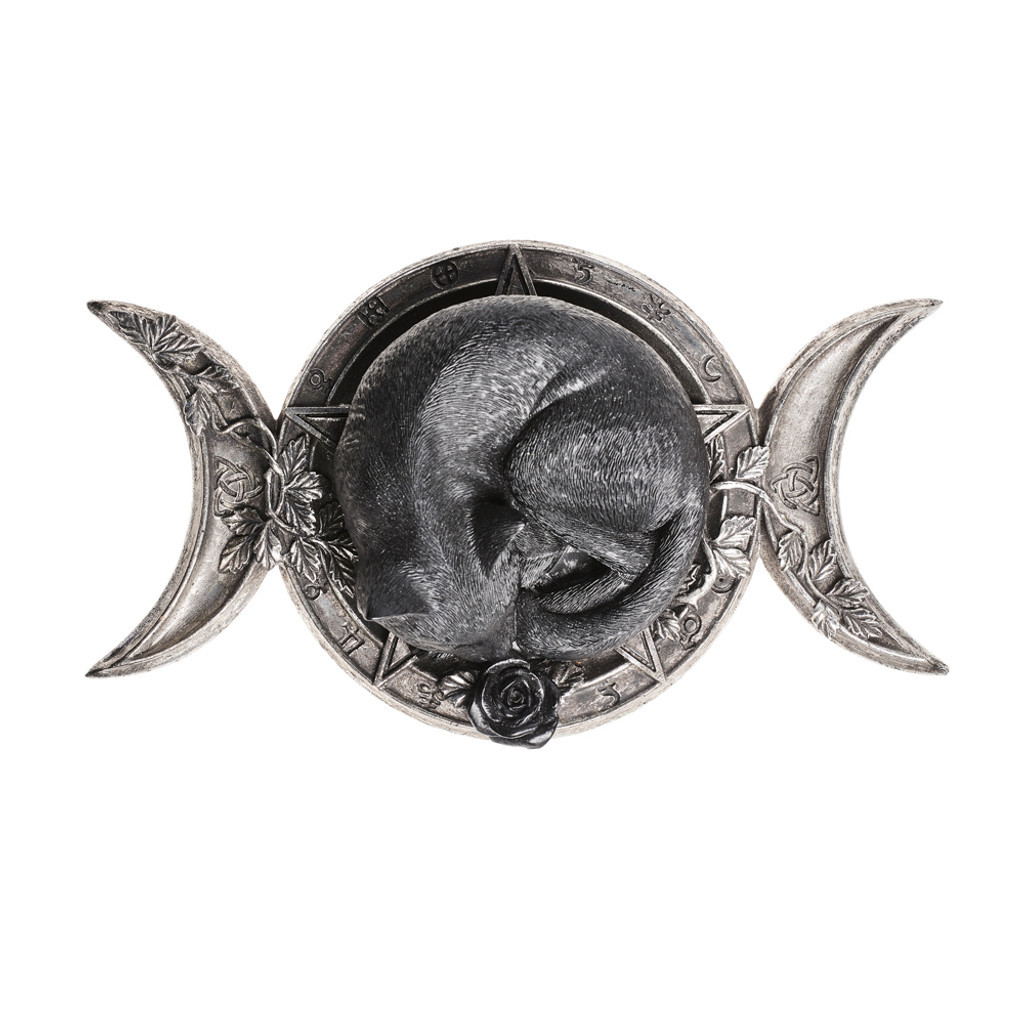 Знакомый для многих дух и спутник ведьм, дремлет в круге силы богини, за которым наблюдают растущая и убывающая луны. Приблизительные размеры: H: 12cm W: 20.5cm D: 5cm Вес: 273g. Материалы: полимерная смола.